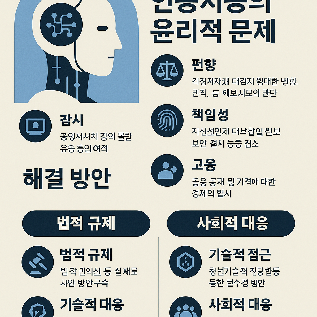 인공지능은 기술 발전의 중심에 서 있지만, 그에 따라 발생하는 윤리적 문제 또한 점점 심각해지고 있습니다. 알고리즘 편향, 프라이버시 침해, 책임 소재 불분명, 자동화로 인한 실업 문제 등 AI가 직면한 다양한 윤리 이슈를 분석하고, 이를 해결하기 위한 사회적·법적·기술적 방안을 제시합니다. 인공지능을 둘러싼 윤리 논쟁에 균형 잡힌 시각을 제시하는 글입니다.