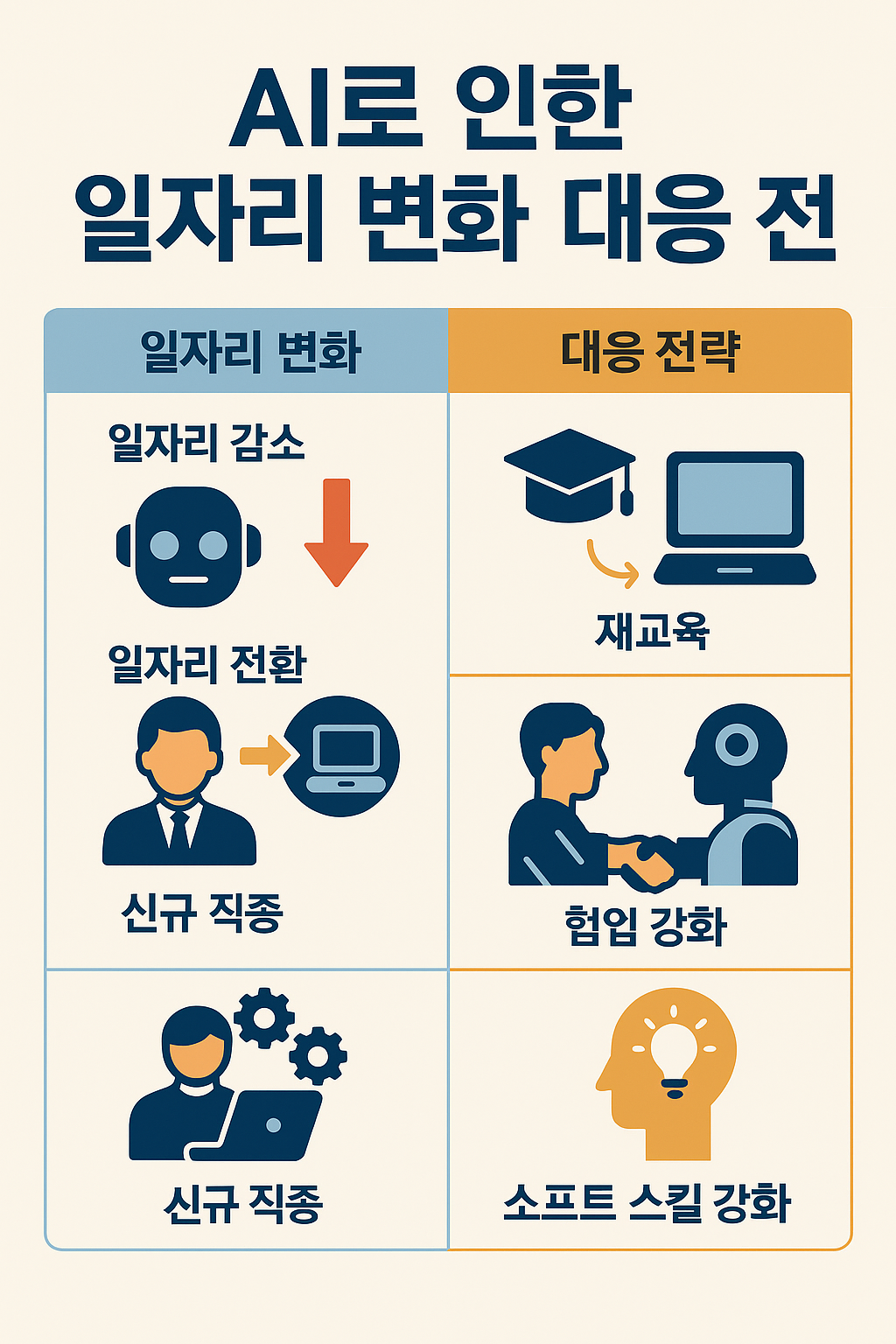 인공지능(AI)의 발전은 산업 전반에 큰 변화를 불러오고 있으며, 그중에서도 고용시장에 미치는 영향은 특히 주목할 만합니다. 본 글에서는 AI로 인해 변화하고 있는 직무 유형, 사라질 가능성이 높은 직업과 새롭게 생성되는 직업의 특징을 분석하고, 개인과 조직이 이러한 변화에 어떻게 대응해야 하는지 전략적으로 제시합니다. 미래 직업 환경에 대한 현실적 통찰과 실행 가능한 방향을 함께 제안합니다.