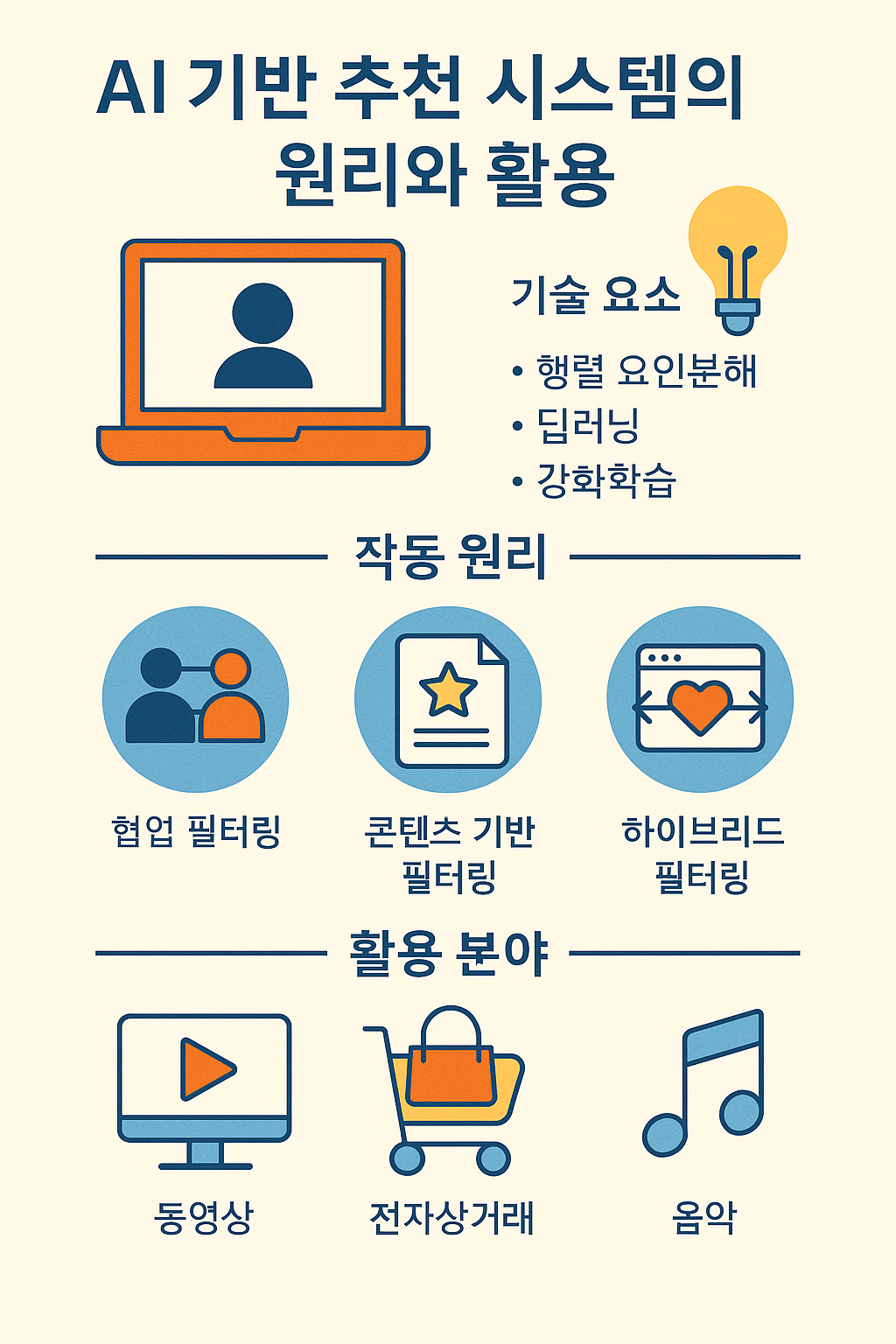 추천 시스템은 오늘날 우리가 접하는 디지털 환경에서 핵심적인 역할을 하고 있습니다. 유튜브의 영상 추천, 넷플릭스의 콘텐츠 큐레이션, 쇼핑몰의 상품 제안까지 모두 AI 기반 추천 알고리즘의 결과입니다. 이 글에서는 추천 시스템의 작동 원리와 대표 알고리즘, 실제 서비스 적용 사례와 함께, 그 이면에 있는 기술적 배경과 사회적 영향까지 자세히 살펴봅니다.
