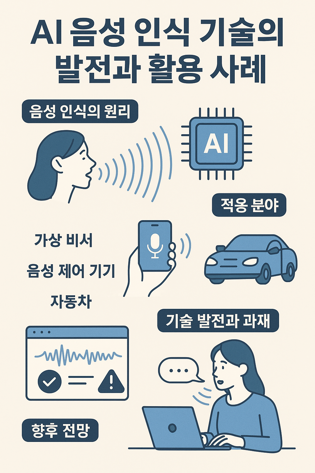 AI 기반 음성 인식 기술은 빠르게 고도화되며, 사람의 말을 이해하고 처리하는 수준에 도달하고 있습니다. 이 글에서는 음성 인식 기술의 기본 원리, 기술적 진화 과정, 스마트 스피커·자동차·헬스케어·금융 등 다양한 분야에서의 실제 적용 사례를 중심으로, 이 기술이 일상에 어떻게 스며들고 있는지 살펴보고, 향후 발전 방향과 사회적 과제까지 함께 분석합니다.